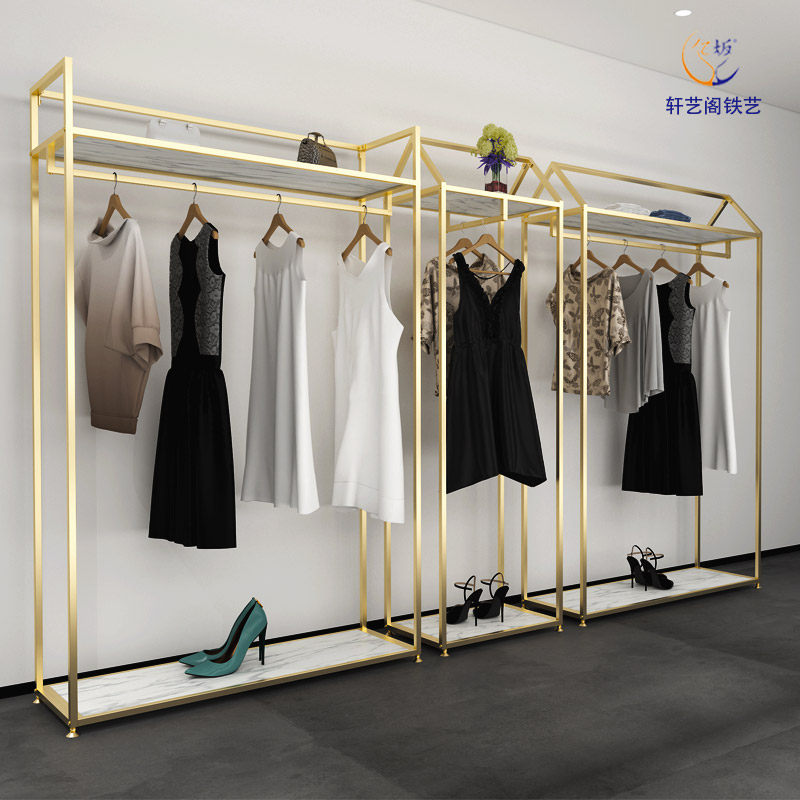 服装店展示架落地式挂衣服架店铺装修效果图金色女童装店双层货架热门设计联盟服务商